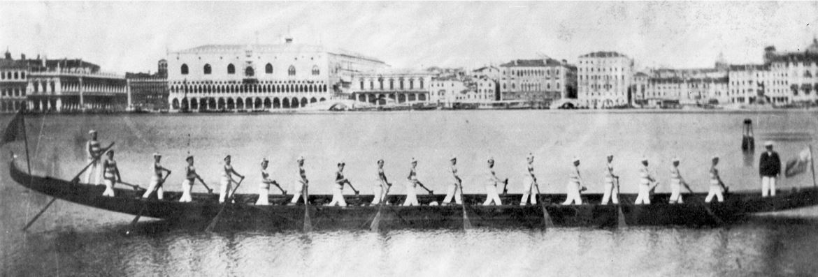 Die weltgrösste Gondel die je gebaut wurde, um ca. 1920 in Venedig mit 18 rudernden Gondolieri.